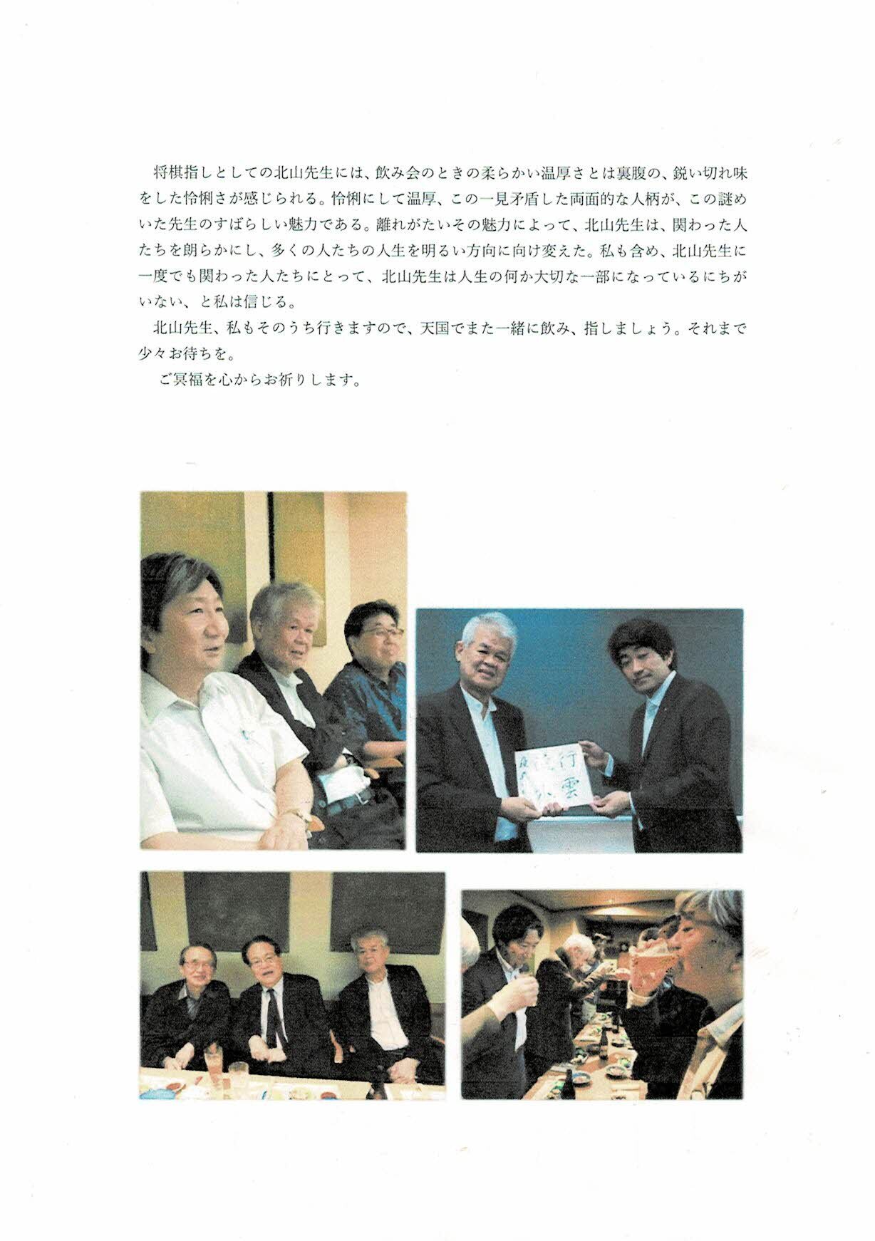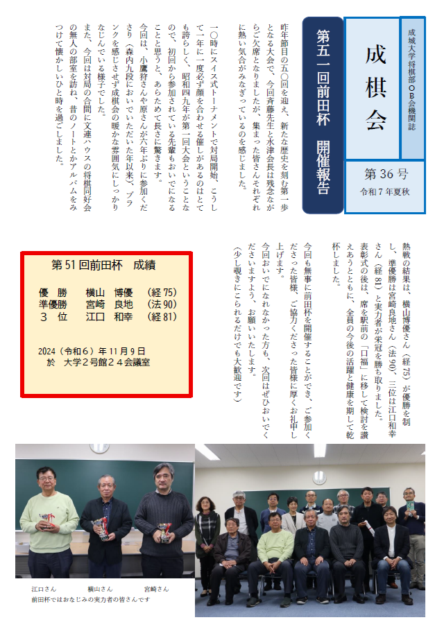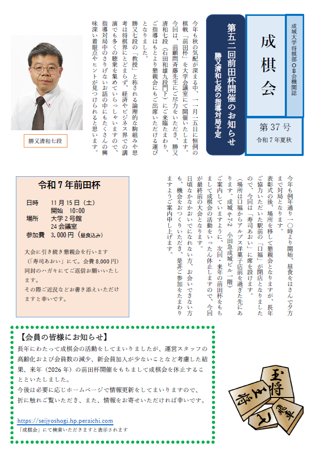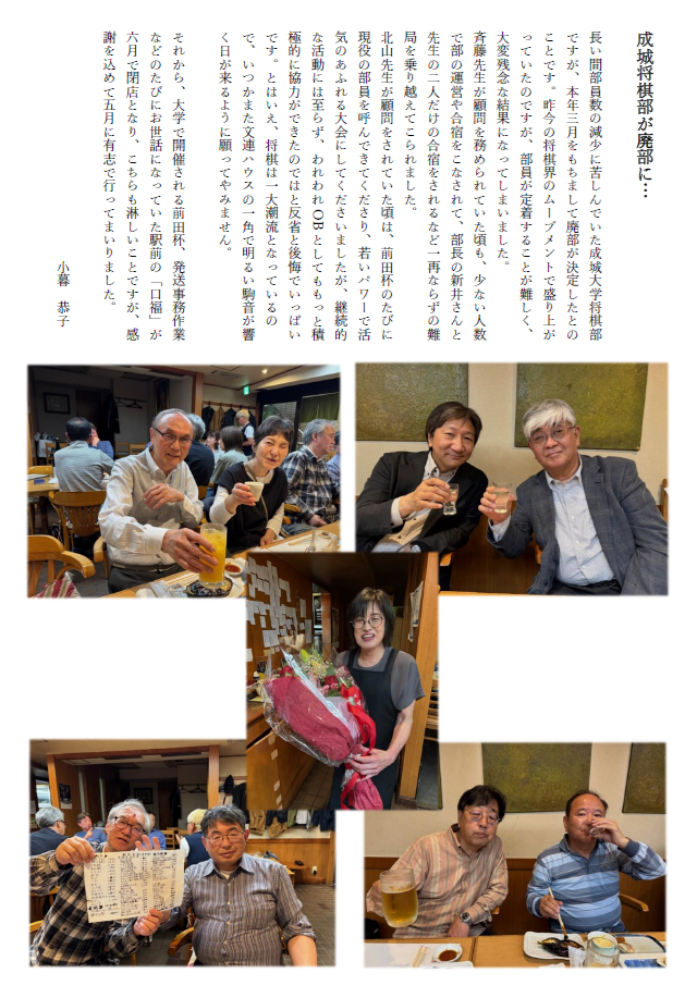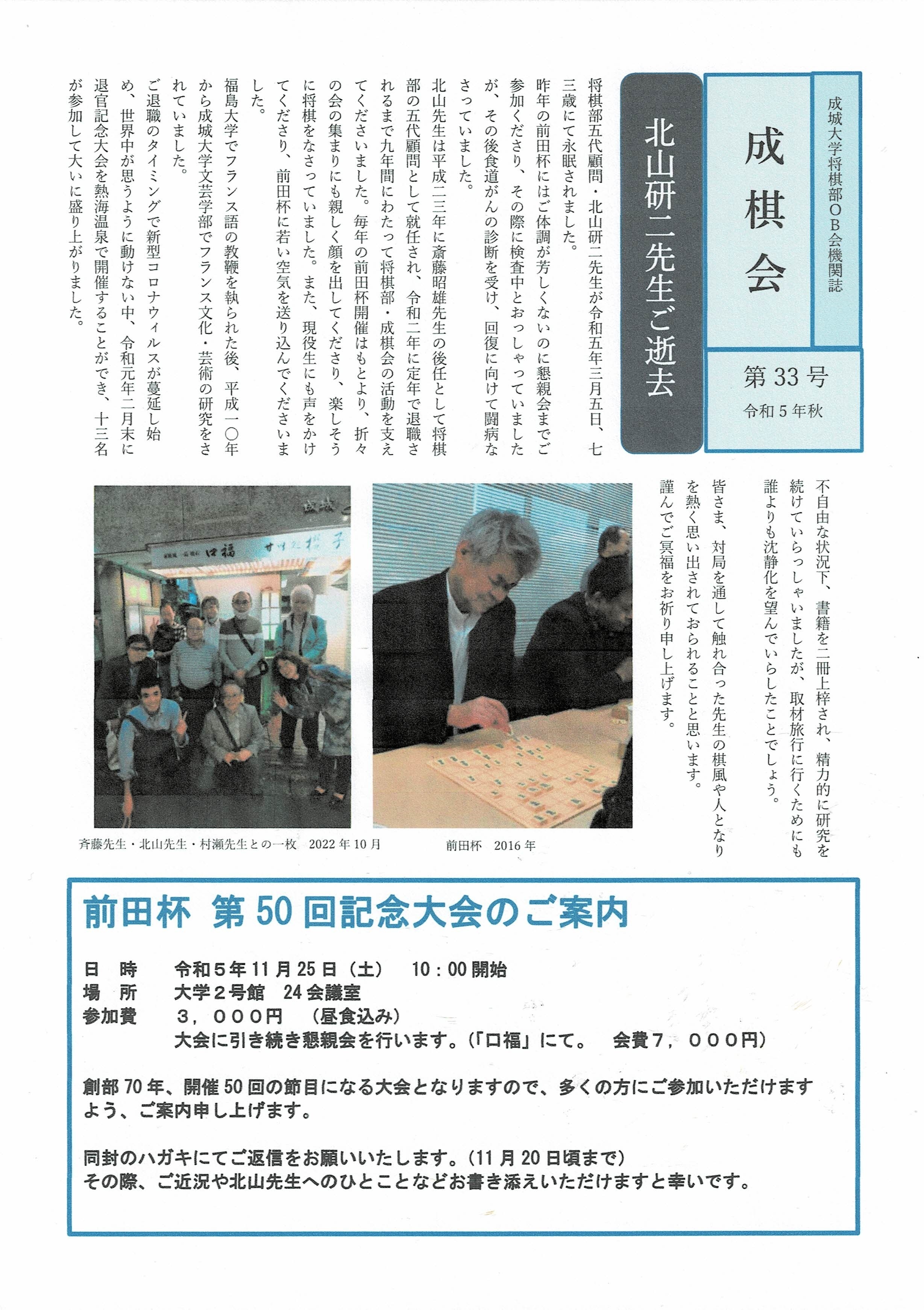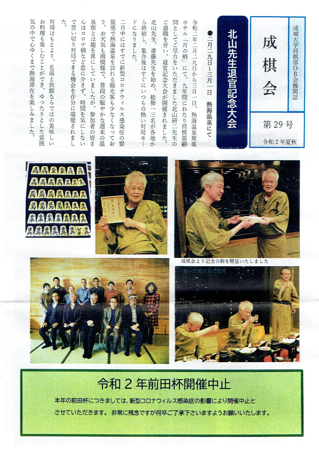 今再び斉藤昭雄教授と卒業生有志の骨折りにより、「成棋会」結成のはこびとなりましたことは、誠に時機を得た事で、2000年の節目とお慶び申し上げます。初代春田伊久蔵教授から引き継ぎ顧問となりました私は合宿に参加するだけでしたが、部員一同の絶え間なき努力は、顧問宮坂幸雄八段を中心とする棋道の精進により有段者を多数出し、大学リーグB級でも有力校となりました。